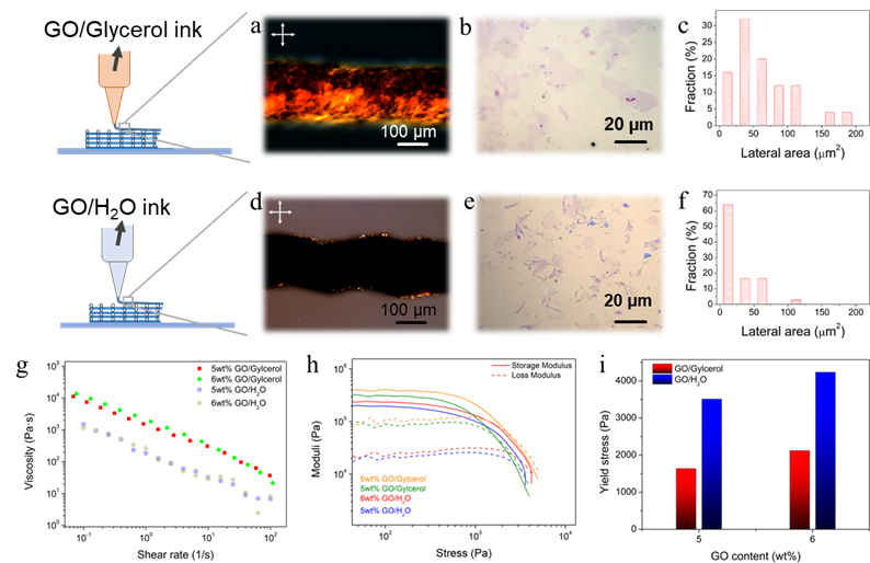 圖1:對比GO/甘油3D打印墨水和重分散GO水系分散液墨水的偏振光顯微鏡照片a)、d),墨水中GO片的顯微照片b)、e)及GO片投影面積的統計結果c)、f)。對比GO/甘油墨水和重分散GO水系分散液在不同濃度(5wt%,6wt%)下的粘度g),動態模量h)和屈服剪切應力i)。
