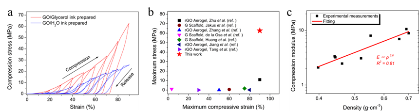 浙江大學高超、許震團隊,利用甘油分子對GO片溶劑化的作用,設計了GO/甘油3D打印墨水。該墨水具有較高的GO固含量(~6wt%),且保持了GO液晶相,實現了GO高濃度的均相分散。利用該墨水制備的石墨烯微晶格材料表現出了高強度(~62.7MPa),高抗壓性(~90% 壓縮形變),高導電性能(x-y平面內導電率2073 S m-1,z方向導電率~250 S m-1)的特性,開拓了新型三維石墨烯框架材料的范疇,為石墨烯材料在儲能,復合材料,催化等領域的應用打下了基礎。