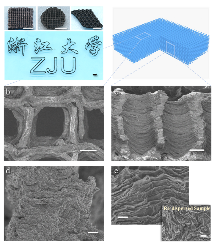 圖2:a)不同結構的石墨烯微晶格樣品及圖案光學照片。3D打印柴垛結構石墨烯微晶格外表面b),內部截面c)及放大d)的電子顯微鏡照片。E)對比由GO/甘油墨水和重分散GO水分散液分別所得到的石墨烯框架材料的片層堆疊情況。