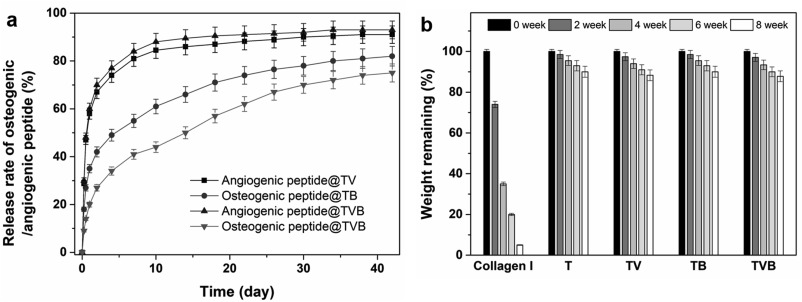 雙肽遞送支架的體外釋放行為和降解行為。 (a)在42天的測試期內釋放血管生成肽和成骨肽的行為; (b)在8周的測試期內雙肽遞送支架和對照的剩余重量。