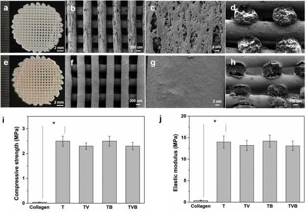 OP / TCP / PLGA和AP /膠原蛋白/ OP / TCP / PLGA支架的形態和力學性能。 (a)和(e):數字圖像; (b-d,f-h):不同放大倍數下不同支架的SEM顯微照片; (i)腳手架和控制的抗壓強度; (j)支架和對照的彈性模量。 T,TV,TB,TVB分別指TCP / PLGA,AP /膠原蛋白/ TCP / PLGA,OP / TCP / PLGA,AP /膠原蛋白/ OP / TCP / PLGA。