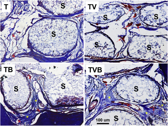 通過Masson三色染色法植入不同支架后3個月,對大鼠顱骨缺損中再生組織的組織學分析。注:“ S”代表支架; “紅色箭頭”表示船只; “黃星”表示新的骨骼和類骨質。 [來源/圖片:“雙重運送支架的低溫3D打印,可通過增強血管生成改善骨骼再生”]