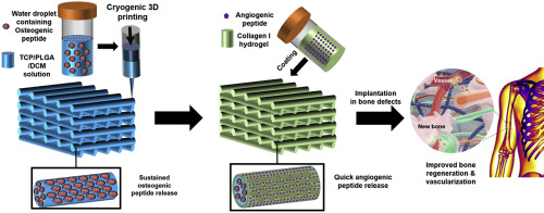通過低溫3D打印和隨后的水凝膠涂層制造AP和OP交付的TCP / PLGA復合支架的示意圖??梢詫⒅Ъ苤踩牍侨睋p中以誘導所需的血管形成改善的骨再生。