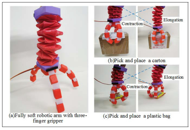 具有高度可逆的可壓縮臂的全軟機械手:(a)具有三指抓具的全軟機械手。 (b)拾取并放置紙箱。 (c)拾起并放置一個塑料袋