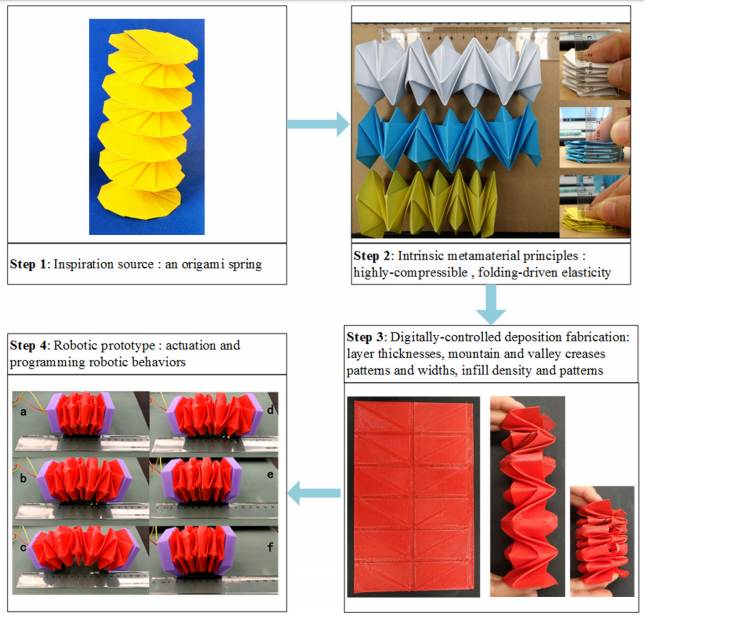 該團隊從可折疊的折紙彈簧開始,然后發展到超材料角色-探索從折疊的幾何形狀獲得的屬性。最終,由于3D打印材料根據需要折疊,他們的原型能夠爬行行為。
