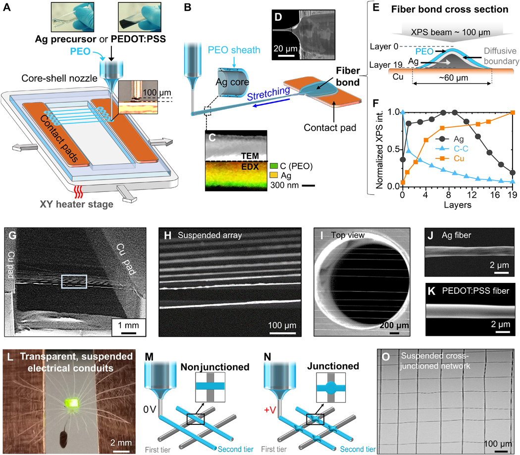 研究人員開發的工藝是直接墨水書寫的一種形式,其中將銀或稱為聚(3,4-乙撐二氧噻吩)的聚苯乙烯磺酸鹽(PEDOT:PSS)的聚合物通過離子槍蝕刻沉積在銅接觸墊上。纖維進入墊。纖維在兩個銅墊之間拉伸,橋接兩個電極。