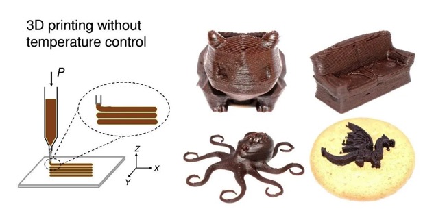 巧克力是由糖和可可粉組成的細小固體顆粒,在連續的脂肪相中形成的復合乳狀液,是人們普遍喜愛的食品。作為一種材料,巧克力在室溫(20至25°C)下為固體,并在人的口和唾液(37°C)中融化。巧克力的融化特性和質地取決于可可粉和其他成分的類型和比例,以及混合和加工它們的方法。在加工過程中混合,精煉和精煉各成分,以便在回火之前獲得合適的巧克力粘度。巧克力通常用于3D食品打印的展示,因為它可以通過熱熔擠出進行圖案化,并在室溫下變為固體。