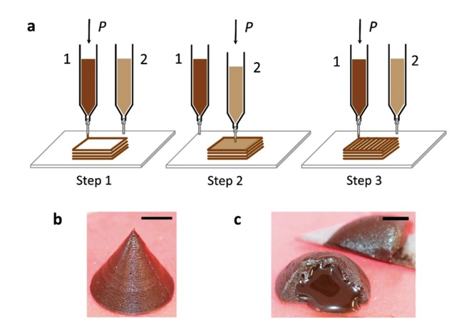 多材料食品Ci3DP。(a)室溫下多種食物材料的DIW涉及的步驟示意圖。步驟的順序允許打印帶有內部填充物的巧克力。(b)包含液體巧克力糖漿作為填充物的錐形外殼的3D結構。(c)突出顯示從3D打印外殼流出的液態巧克力糖漿的光學圖像。比例尺= 1 cm。