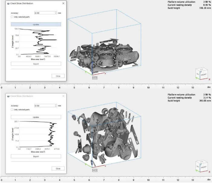 對于SLS或MJF打印機,打印成功的另一個重要因素是熱量能均勻分布。不均勻的擺放會使平臺內產生大的溫差,使零件發生變形。為了解決這個問題,數據準備人員必須檢查每一層切片的面積之間是否有大的差異,而切片分布圖可以有效地解決這個問題。