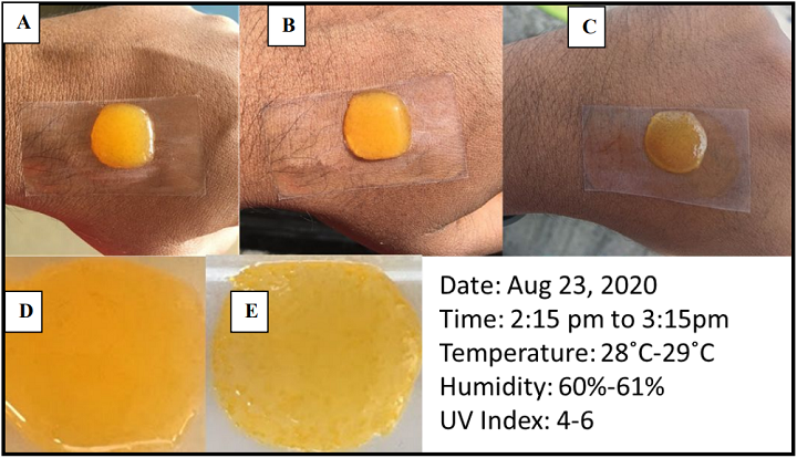 將10 x 10毫米見方的傳感器3D打印在透明的壓敏包裝帶(A,D)上,將傳感器粘貼到受試者手背上后進行室外測試(B)一小時。然后,受試者在大學校園內散步以模仿現實生活中的使用。一小時結束時,明顯觀察到比色變化(C,E)。應當注意的是,隨著對象走過僅隨機暴露于紫外線輻射的區域,傳感器在整個一小時中都不會始終暴露在陽光下。