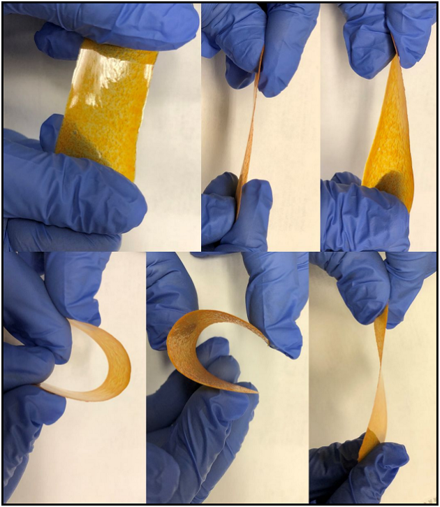 為了證明干燥傳感器的出色機械性能,對75 x 25 x 0.5mm的薄膜進行3D打印并干燥。然后,該樂隊受到各種機械力的影響,以了解其反應。在每側以90°角彎曲50次并在每側扭曲50次后,表帶沒有變形。在這些測試之前和之后對這些帶進行拉伸測試。即使沿帶的長度施加100 N的單軸力,帶也不會單軸斷裂或變形。