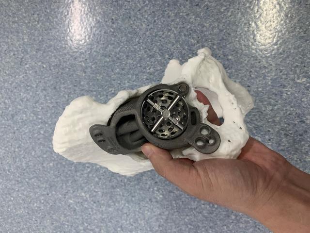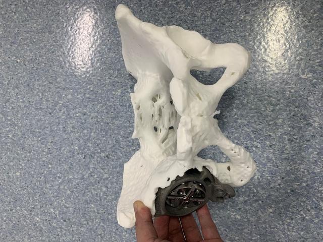 對于復雜髖關節翻修多為高齡患者,由于骨缺損巨大、骨質疏松等因素,存在手術難度大、手術費用高等難題。近日,哈醫大一院骨科一病房3D打印團隊,應用3D打印技術,通過術前打印骨骼模型進行模擬假體安裝,成功為一名70歲,全髖關節置換術后15年,髖臼骨缺損巨大,髖臼上部坐骨、髂骨存在巨大空洞型缺損的患者實施了我省首例金屬3D打印三翼髖臼假體(Triflange)+股骨柄假體髖關節翻修術,為患者更換了一個新的、穩定的髖關節。目前患者已康復出院。