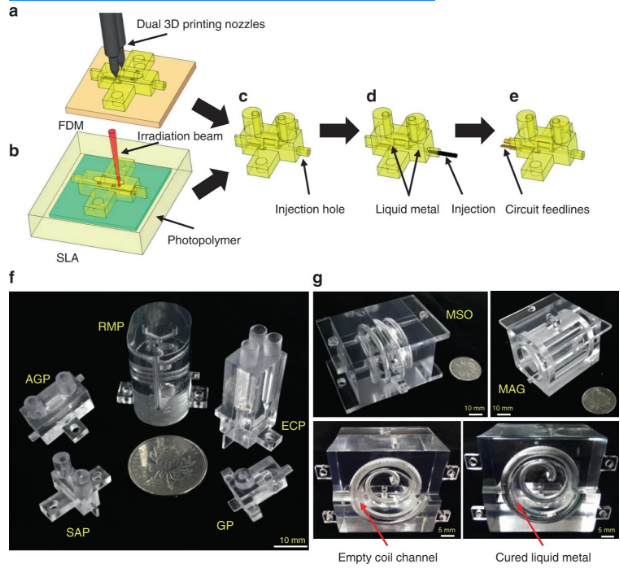 在研究過程中,研究人員演示了一種結合計算機輔助設計(CAD),3D打印和液體熔化注入技術來創建集成式MR探頭的方法。熔融沉積建模(FDM)和立體光刻技術均用于制造探頭,該探頭由帶有微米級導線的RF線圈,定制的樣品室和RF電路接口組成,并包裹在單個印刷聚合物塊中。3D Systems的ProJet 3510 SD 3D打印機用于通過FDM制作MR原型的一個版本,其打印分辨率為30μm。在打印過程中,從打印機的雙噴嘴之一擠出材料,以構造成型結構和空心線圈腔。對于在嘉興山威機電公司的Cyclone W-1打印機上印刷的光刻技術生產的探頭,這些模型是通過光聚合逐層創建的,打印分辨率為25μm。紫外線激光聚焦在一大桶光敏聚合物樹脂上,使分子鏈鏈接形成聚合物,從而構成了探頭的主體。