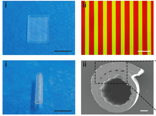為了創(chuàng)建自己的自粘繃帶,研究人員使用數(shù)字光處理(DLP)3D打印機將一組可點擊的官能化單體聚合為矩形。對于每個結(jié)構(gòu)的第二層,部署了一種不同的墨水,其中包含XMU-MP-1納米顆粒,該藥物用于促進患者蛋白質(zhì)和細胞的生長。