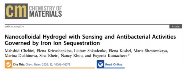 最近,加拿大多倫多大學Eugenia Kumacheva教授團隊報告了一種利用具有強大的Fe3+離子螯合能力的納米膠體水凝膠來抗菌傷口敷料的新方法,從而使細菌失去了急需的離子鐵并抑制了細菌的生長。相關論文已經發表在《Chemistry of Materials》上。