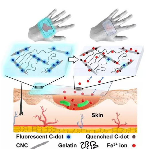 水凝膠衍生自裝飾有碳點(C-dot/CNCs)的纖維素納米晶體。納米原纖維水凝膠吸收Fe3+離子后,由于離子在C點表面的吸附,水凝膠的光致發光被淬滅,從而報道了離子鐵從介質中的去除。水凝膠抑制了耐藥性革蘭氏陰性大腸桿菌,銅綠假單胞菌和革蘭氏陽性金黃色葡萄球菌的生長,并且對人成纖維細胞無細胞毒性。傷口敷料很容易使用三維(3D)打印制造。水凝膠抗菌性能的新機制,其傳感能力,生物相容性以及3D打印傷口敷料貼片的能力使其成為制造高級傷口敷料的非常有前途的材料。