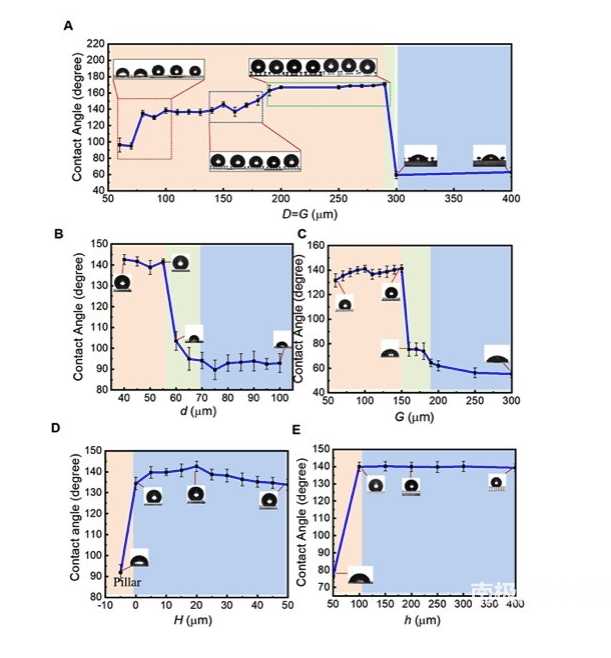 圖2. 通過精確控制微蘑菇的莖的直徑(d)、高度(h),蘑菇頭的直徑(D)、高度(H)以及相鄰蘑菇的間隙(G)可控調(diào)節(jié)表面的潤濕性。