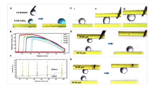 在此基礎(chǔ)上,團(tuán)隊(duì)利用制備的仿生超疏水表面實(shí)現(xiàn)了微液滴的定向轉(zhuǎn)移和可控融合,搭建了可用于微液滴化學(xué)反應(yīng)的反應(yīng)臺(tái)。相關(guān)研究成果在生物醫(yī)療、分析化學(xué)以及微流控等領(lǐng)域具有重要的應(yīng)用前景。