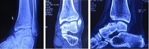 患者,男,28歲,左踝關節疼痛1年,加重3個月,影像學表現為左距骨內髁壞死、塌陷,面積約3*2cm大小。距骨壞死的治療,對直徑在2cm以內的距骨壞死,可以采用自體股骨髁骨軟骨移植、自體帶骨膜髂骨移植等方法,但對于直徑超過2cm的距骨壞死,尤其是年輕患者,一直是治療的難點。搜索國內外文獻,對于超過2cm距骨壞死,一般采用踝關節融合、踝關節置換、同種異體距骨移植、全距骨置換等方法。但上述方法均有弊端:采用關節融合,患者喪失踝關節功能;踝關節置換、全距骨置換對于年輕、距骨單髁壞死患者,創傷大,且需要多次的返修手術;國外有采用同種異體新鮮距骨移植的報道,但目前國內還沒有相關的骨組織工程庫。經手術團隊術前充分討論,認為3D打印技術因其個性化的設計已經越來越多地應用于臨床,決定對患者行3D打印距骨部分置換手術。