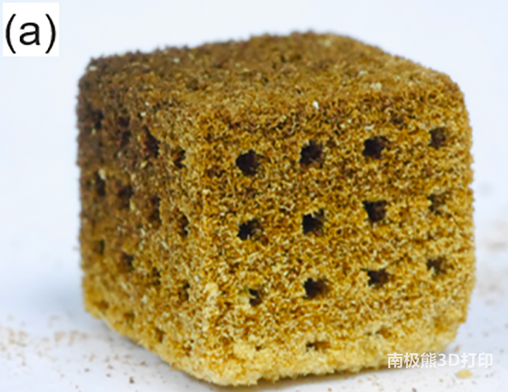 有了足夠的原材料后,團隊就使用商用3D打印機的熱固化站將它們與ExOne粘結劑交聯,產生了一組立方體標本。有趣的是,通過改變系統的粘結劑飽和度參數,研究人員能夠確定提供可調節孔隙度水平的結構的比率。