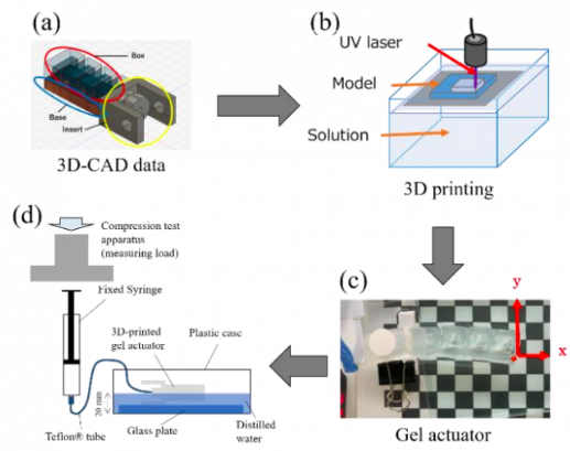 在Yamagata團隊開始3D打印其執行器之前,他們合成了一種新型的交聯P-DN水凝膠,該凝膠由硬而脆的第一聚合物和較軟的第二層組成。該材料的特點是高含水率,增強的強度和出色的可印刷性,為它們的裝置形成了堅實而易延展的基礎。