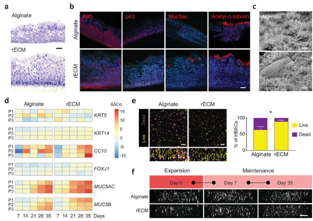 Wagner(音譯:瓦格納)和她的團(tuán)隊首先將海藻的藻酸鹽與肺組織的細(xì)胞外基質(zhì)結(jié)合起來,形成了生物墨水。然后將生物墨水中載有在人氣道中發(fā)現(xiàn)的干細(xì)胞,并進(jìn)行3D打印以形成模仿這些氣道的復(fù)雜且機(jī)械穩(wěn)定的組織構(gòu)造。瓦格納說:“我們從制造小管開始,從小做起,因為這是氣道和肺血管中都存在的特征。通過將我們的新型生物墨水與從患者氣道分離的干細(xì)胞一起使用,我們能夠?qū)哂卸鄬蛹?xì)胞并隨時間保持開放的小氣道進(jìn)行生物打印?!?/span>