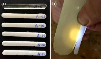 圖1. (a) 具有各種TCP含量的聚合Bis EMA,在每個條的右側以wt.%表示;(b) 象牙半透明性的比較(左)和固體含量為55wt.%時,Bis EMA的比較 wt.%(右)。
