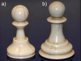 ▲圖3. 3D打印的帶有手術刀線條的棋子;茶染色和拋光(a)沒有和(b)具有表面紋理以模仿特征Schreger線。