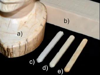 圖2. 比較(a)象牙, (b) 象牙替代品Elforyn, (c) 象牙替代品"Digory"沒有著色, (d) 有色顏料和 (e) 有色顏料和淺茶色的比較。