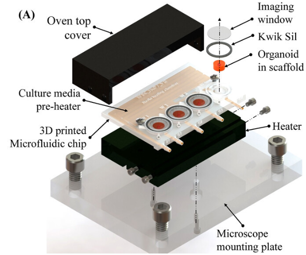 在他們的實驗裝置中,科學家使用了Form 2 3D打印機和生物相容性樹脂來生產帶有內置“成像孔”的微流控芯片,從而使他們能夠長期培養類器官。一旦植入裝有Matrigel的神經細胞,這些設備將被覆蓋一個透明的玻璃盤,并在定制的生物反應器中加熱,這使得該團隊可以密切監視其類器官的進展。