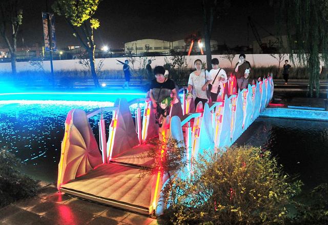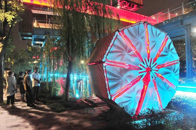 在為期兩月的城市空間藝術(shù)季活動(dòng)期間,這里將陸續(xù)推出各類精彩紛呈的文體活動(dòng)和展覽。中國(guó)首座運(yùn)用3D打印技術(shù)制造的可伸縮景觀人行橋在夜幕下格外引人注目,這座橋還可以做“卷腹運(yùn)動(dòng)”。卷起來(lái)時(shí)像一個(gè)大輪子,橋身躺平后,市民游客可以在橋上漫步。