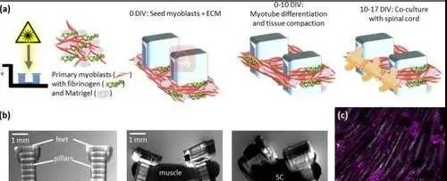 以前在骨骼肌上的工作通常使用C2C12成肌細胞來研究體外的肌肉分化、力量產生和神經肌肉相互作用。當時一些工作完全通過外部控制機制,如外加電場、光遺傳學或化學刺激,繞過了運動神經元輸入到肌肉的過程。然而,神經元和肌肉在單一培養或一起培養時表現出不同的表現和行為。因此,為了建立神經肌肉接點(NMJ)的體外模型,對這些細胞進行共培養是很重要的,以使突發性組織和多細胞相互作用能夠在體外發生。