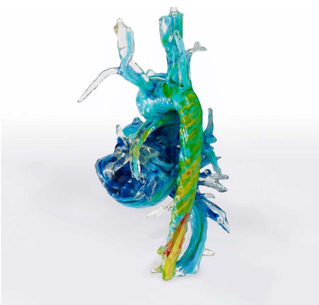 為了進一步評估患者心臟的血液流動情況,Mitchell醫生的研究團隊進行了4D核磁共振血液流動分析。這使得調查員能夠描繪出血液經過心臟進入血管的流動情況。由于患者主動脈的流出方向很不尋常,Mitchell醫生認為其血液流經心室進入主動脈的血流情況高度異常,并且很可能效率低下。這一觀點得到了證實,Mitchell醫生要求在手術前使用多材料3D打印心臟模型,以演示異常的血液流動路徑(圖 3a)。