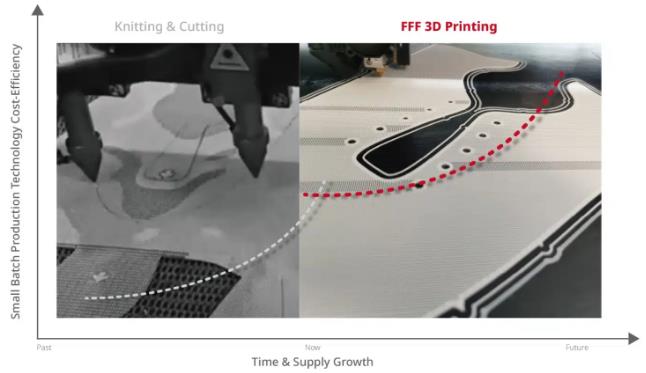 從 PEAK 的經驗中得出的要素之一是:使用 3D 打印可大大降低單位生產成本,使其成為小批量生產的理想選擇。在傳統工藝中,鞋面的批量生產是通過編織和裁剪進行的。這種工藝的成本結構不適合小批量。購買一套針織和裁剪設備需要大約25,000美元的極高