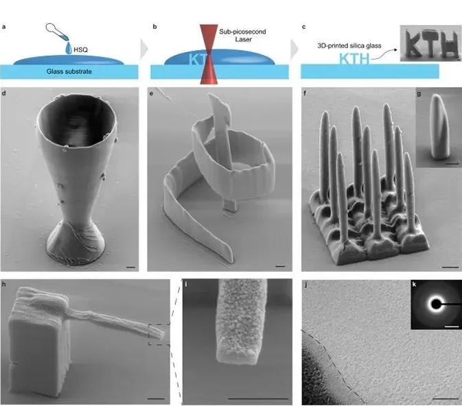 作者指出,針對二氧化硅玻璃(無定形二氧化硅)的3D打印仍存在挑戰(zhàn),特別是在微尺度上。雖然已經(jīng)嘗試了幾種方法來解決這一問題,包括立體光刻、直接墨水書寫和數(shù)字光處理等技術(shù),但即使是最先進的技術(shù)也只能實現(xiàn)幾十微米數(shù)量級的特征尺寸。目前使用的溶膠-凝膠工藝涉及將二氧化硅納米顆粒負載到有機混合物中,因此最終的印刷結(jié)構(gòu)是復合材料,而非純石英玻璃,這導致了一些不理想的特性,如熱穩(wěn)定性、化學穩(wěn)定性、硬度和寬波長范圍內(nèi)的光學透明度。