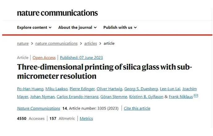 △相關(guān)研究成果已發(fā)表在《自然通訊》雜志上,題目為“亞微米分辨率下的3D打印二氧化硅玻璃”
