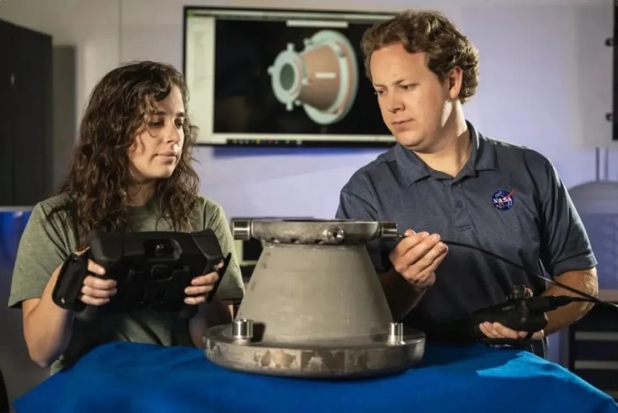 △來自阿拉巴馬州亨茨維爾馬歇爾太空飛行中心的 NASA 工程師 Tessa Fedotowsky 和 Ben Williams 在成功進行熱火測試后檢查 RAMFIRE 噴嘴。資料來源:美國宇航局