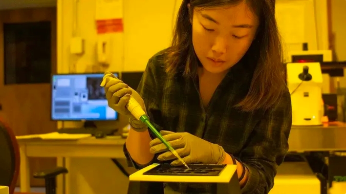 △機械工程研究生張文欣在納米制造實驗室工作