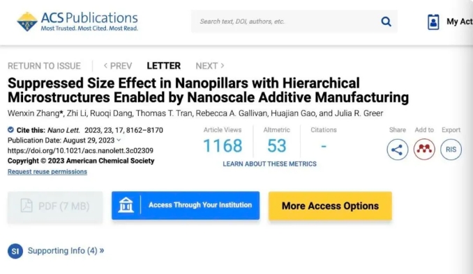 △論文題目為“通過納米級增材制造抑制具有分層微觀結(jié)構(gòu)的納米柱的尺寸效應(yīng)”